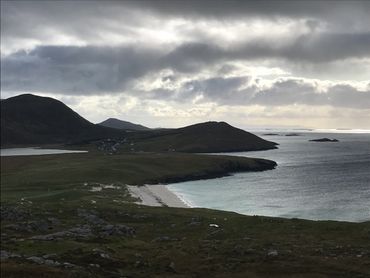The wide gravel track taken by Martin beckoned from the other side of a wooden gate marking the end of the road proper. Past a couple of groups of cattle, we wove our way onto the south side of the narrowing peninsular, and thence up past a small ruined church and onto the open hill. The weather was holding off, but recent downpours had left the hill pretty wet in parts. an hour later, we were treated to some amazing views across to Taransay, and further north to The Clisham.