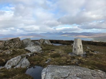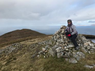 Every so often the clouds parted and we were treated to increasingly panoramic views across the coast to Taransay and over Luskentyre to the main Harris hills. The wind had really got up by the time we reached the summit cairn and the nearby Trig point - as you can tell by how well Joanne wrapped herself up...
