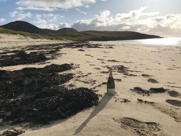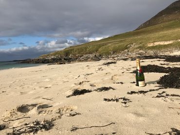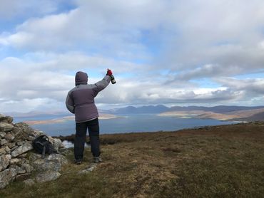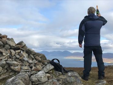 While we were up there on our own visit to the summit, we staged a couple of photos in honour of her climb, complete with champagne. We each took a turn to toast Martin while looking across the open bay to The Clisham, the highest hill on the horizon.