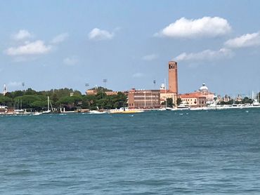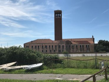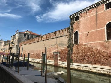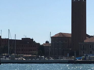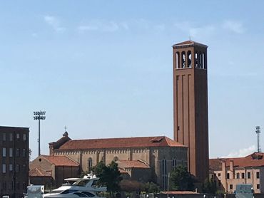 A truly impressive structure, it's tower and high walls dominating the easternmost tip of the Venetian mainland. In THE QUARANT, both Malin and Bourchier find it easy to access the grounds between the church and the Lagoon, but today, it's a real conundrum.We wandered back and forth for almost an hour trying to find a way to access the waterfront, but finally gave up - the site is now bounded by a restricted military zone, the Stadium Pier Luigi Penzo (the home of Venice FC, but to my deteriorating mood that day, walking repeatedly around the stadium perimeter in the increasing heat and humidity of the day, it felt more reminiscent of those South American arenas where dictators pursue mass slaughter and the Disappearance of their opponents).